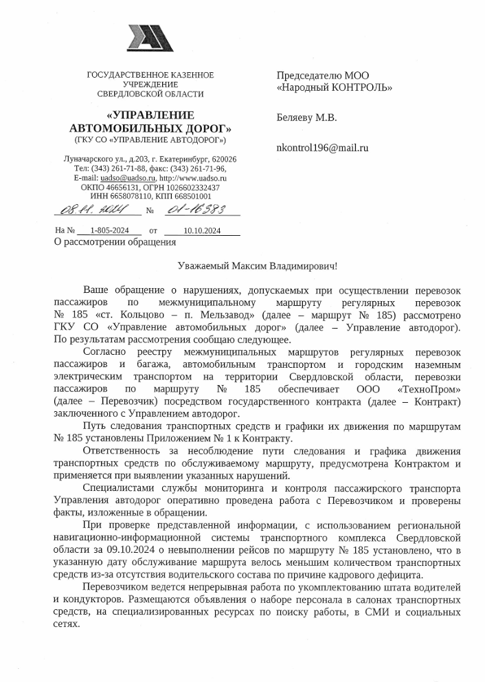 ГКУ СО «Управление автомобильных дорог» Свердловской области после проверки подтвердило, что 9 октября обслуживание маршрута действительно велось с меньшим количеством транспорта из-за кадрового дефицита. Перевозчик ООО «ТехноПром» ведет набор водителей и кондукторов, размещая объявления в салонах, на сайтах по поиску работы, в СМИ и соцсетях.