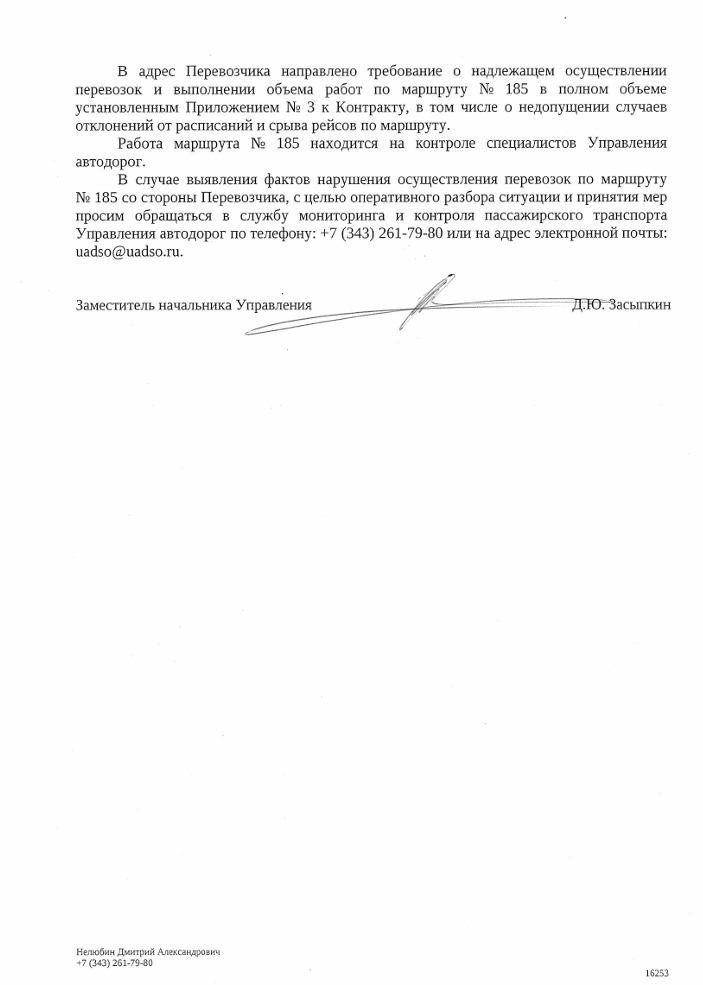 В начале октября 2024 года жители города Арамиль обратились с жалобой на нарушения в работе маршрута № 185 «п. Мельзавод – ст. Кольцово». Пассажиры отметили, что автобусы перестали соблюдать расписание, что вызывает трудности в условиях наступивших холодов. Причиной сбоев, по словам перевозчика, является нехватка водительского состава, из-за чего работа автобусов стала менее стабильной.