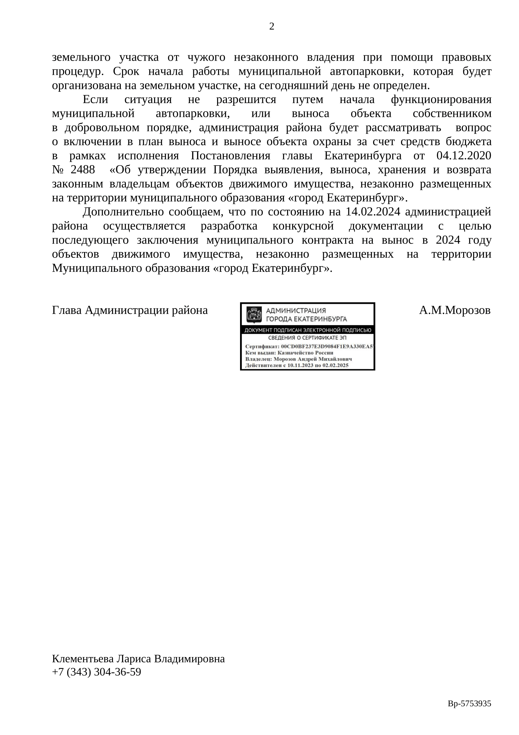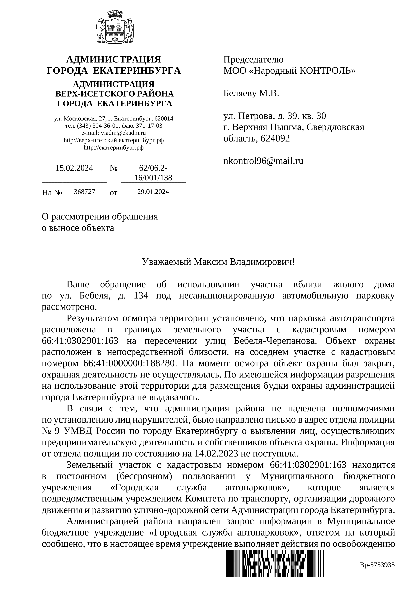 Ответ по по вопросу присвоения общественной парковки на улице Бебеля в Екатеринбурге