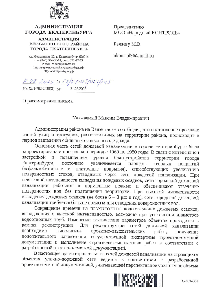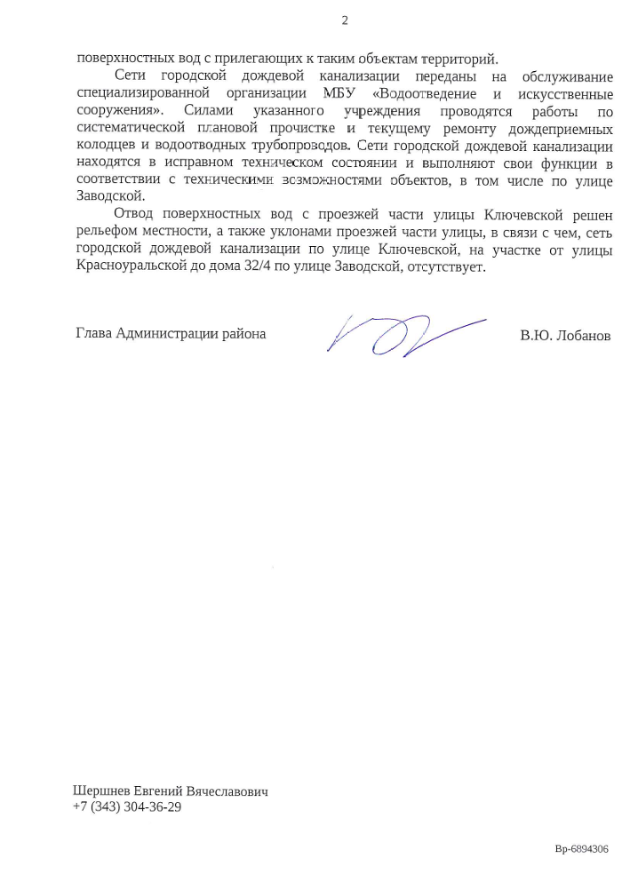 В ответе администрации объясняется, что ливневая канализация в этом районе была построена несколько десятилетий назад и не рассчитана на современные нагрузки. На участке улицы Ключевской система ливневой канализации вообще отсутствует: водоотвод осуществляется исключительно за счет естественного рельефа местности. Кардинальное решение проблемы требует масштабной реконструкции, которая запланирована, но не может быть выполнена быстро из-за необходимости проектирования, экспертиз и значительного финансирования.