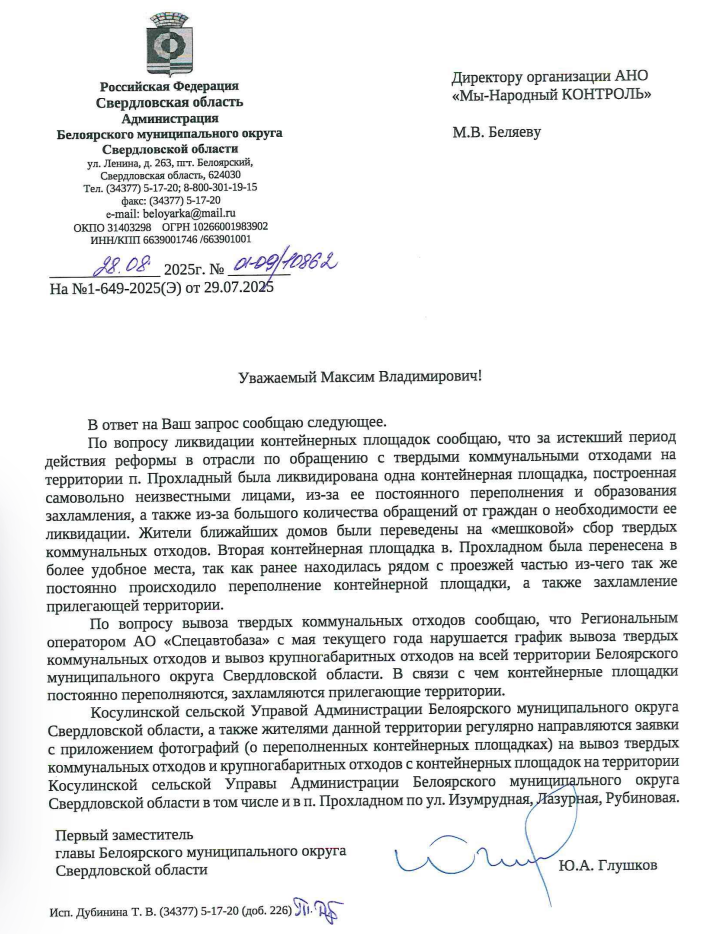 В ответе администрации Белоярского округа сообщается, что одна контейнерная площадка была ликвидирована из-за самовольной установки и постоянных жалоб жителей, а другая была перенесена в более удобное место. При этом основная причина проблем с мусором заключается в систематических нарушениях графика вывоза отходов региональным оператором АО «Спецавтобаза», которые фиксируются с мая 2025 года на всей территории муниципального округа.