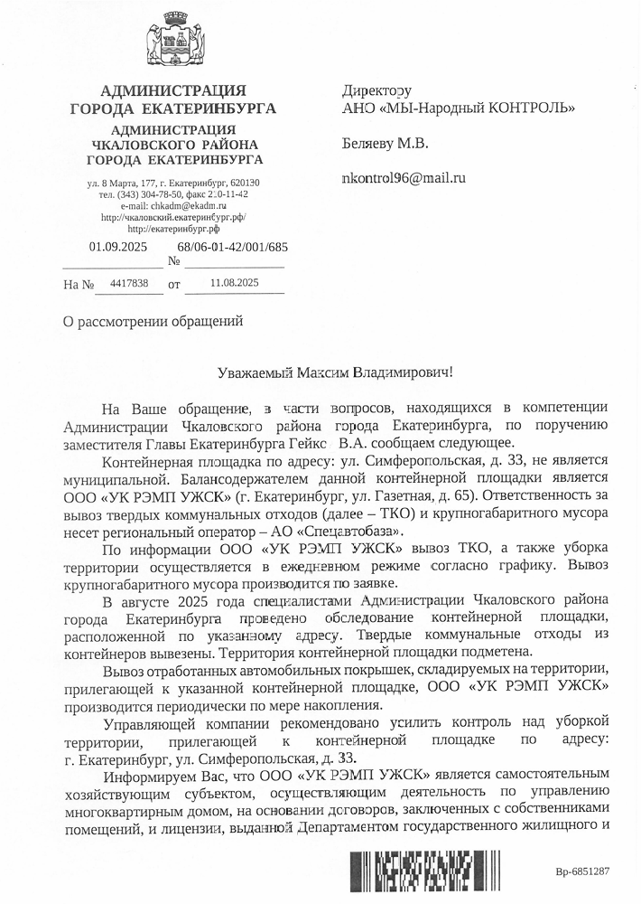 В ответе администрации Чкаловского района указано, что контейнерная площадка не является муниципальной собственностью, а её балансодержателем является ООО «УК РЭМП УЖСК», которое отвечает за уборку территории и вывоз мусора.