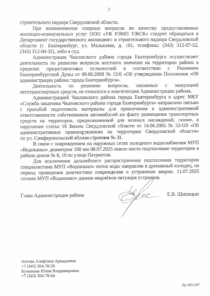 По данным управления, проверка в августе 2025 года показала, что контейнеры вывезены, а территория подметена. При этом администрация рекомендовала управляющей компании усилить контроль за уборкой, а жителям предложили обращаться в Департамент государственного жилищного надзора или в суд для решения спорных вопросов.
