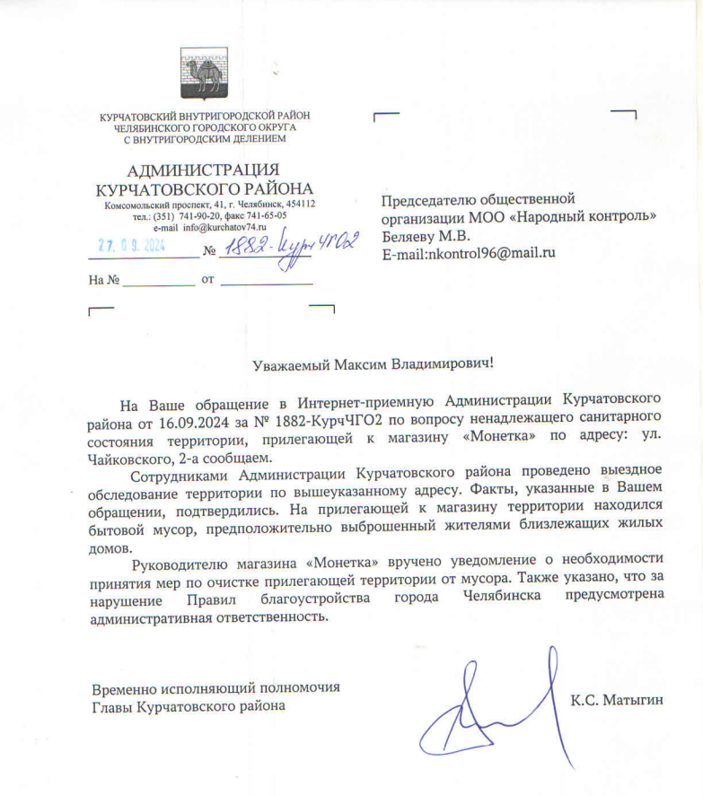 Публикуем ранее поступивший ответ по обращению жителей города Челябинск о ненадлежащем состояния территории вокруг магазина «Монетка», который арендует площадь по улице Чайковского 2а.