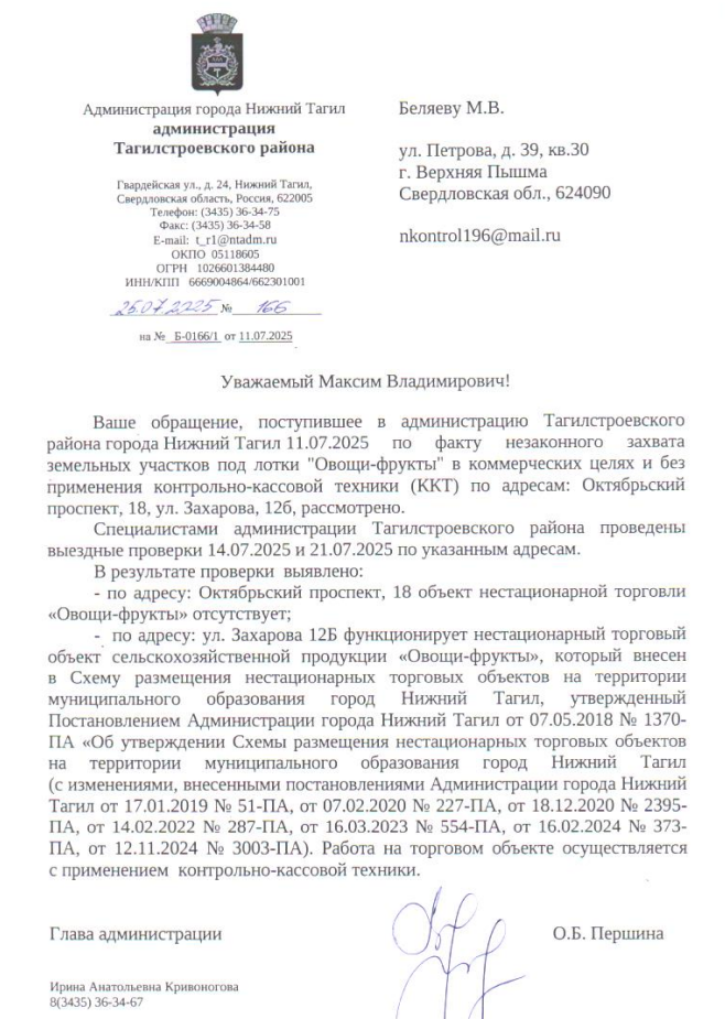 По результатам проверок, проведённых администрацией Тагилстроевского района, выяснилось, что на Октябрьском проспекте, 18 торговый объект отсутствует, а на ул. Захарова, 12Б работает легальный нестационарный торговый пункт «Овощи-фрукты», внесённый в официальную схему размещения и использующий кассовую технику. Таким образом, фактов нарушения законодательства по данным адресам не обнаружено