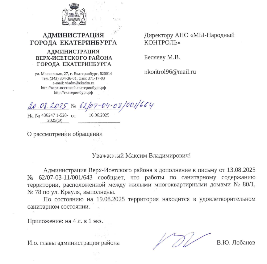 19 августа 2025 года администрация Верх-Исетского района направила жителям ответ. В нем сообщается, что работы по санитарному содержанию территории выполнены в полном объеме. На дату составления документа, 19 августа, состояние территории было признано удовлетворительным. К письму приложены фотоматериалы, подтверждающие факт выполнения работ.