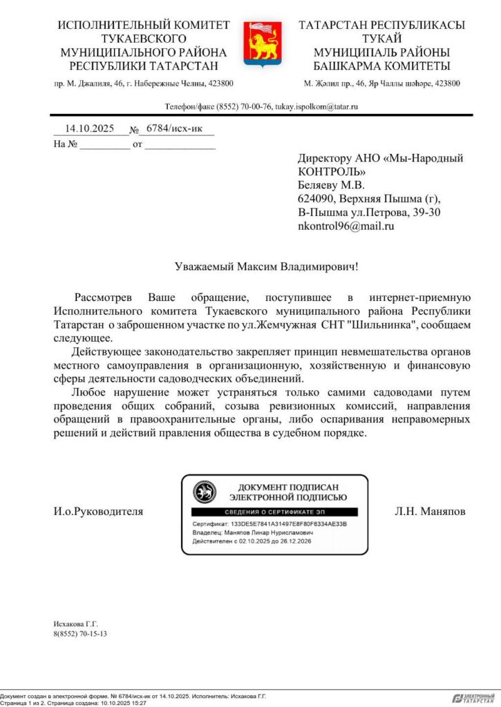 В официальном ответе Исполнительный комитет Тукаевского района пояснил, что действующее законодательство ограничивает вмешательство органов местного самоуправления в деятельность садоводческих объединений.