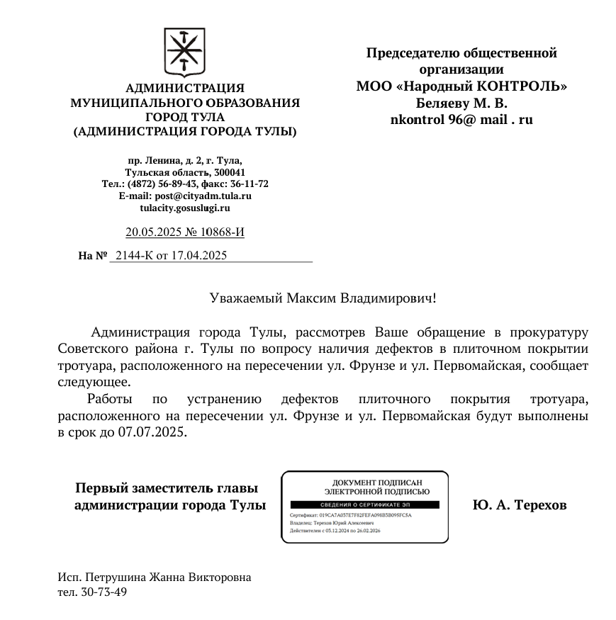 20 марта этого года из города Тула была получена жалоба на разрушенный тротуар на пересечении улиц Фрунзе и Первомайской. Сообщалось, что проблема существует уже несколько лет — еще в 2024 году жители получали отказ с формулировкой «отсутствие финансирования».