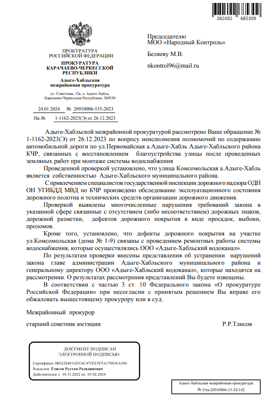 Внесены представления об устранении нарушений главе администрации Адыге-Хабльского муниципального района и генеральному директору ООО «Адыге-Хабльский водоканал», которые находятся на рассмотрении. О результатах рассмотрения представлений Вы будете извещены.