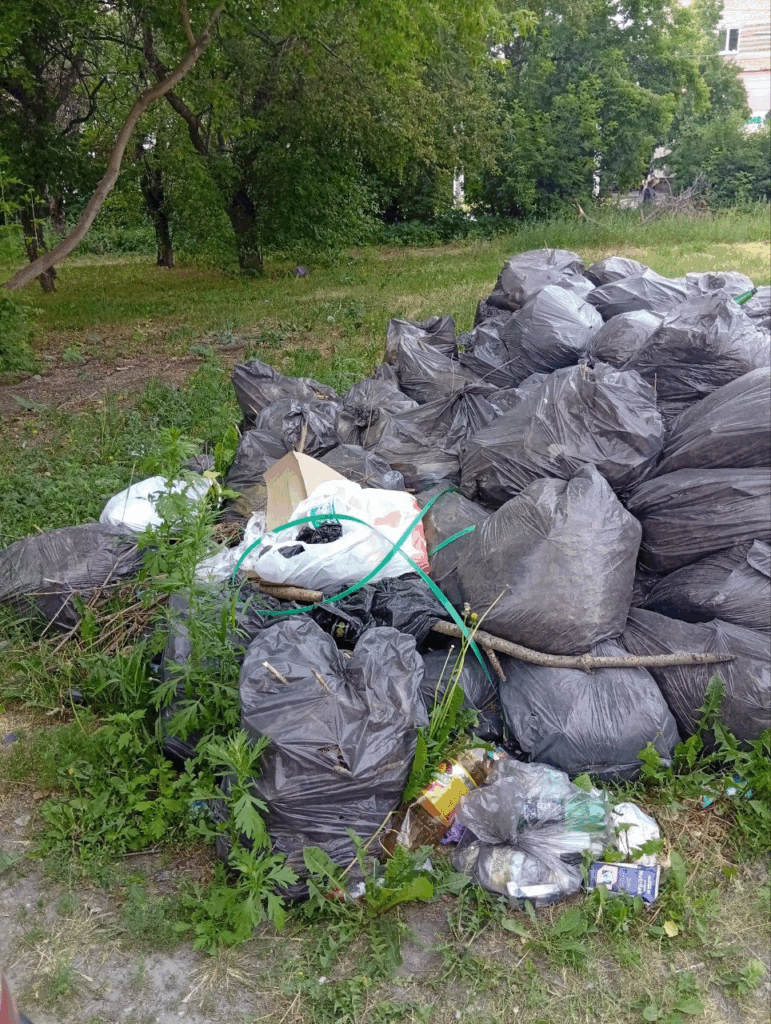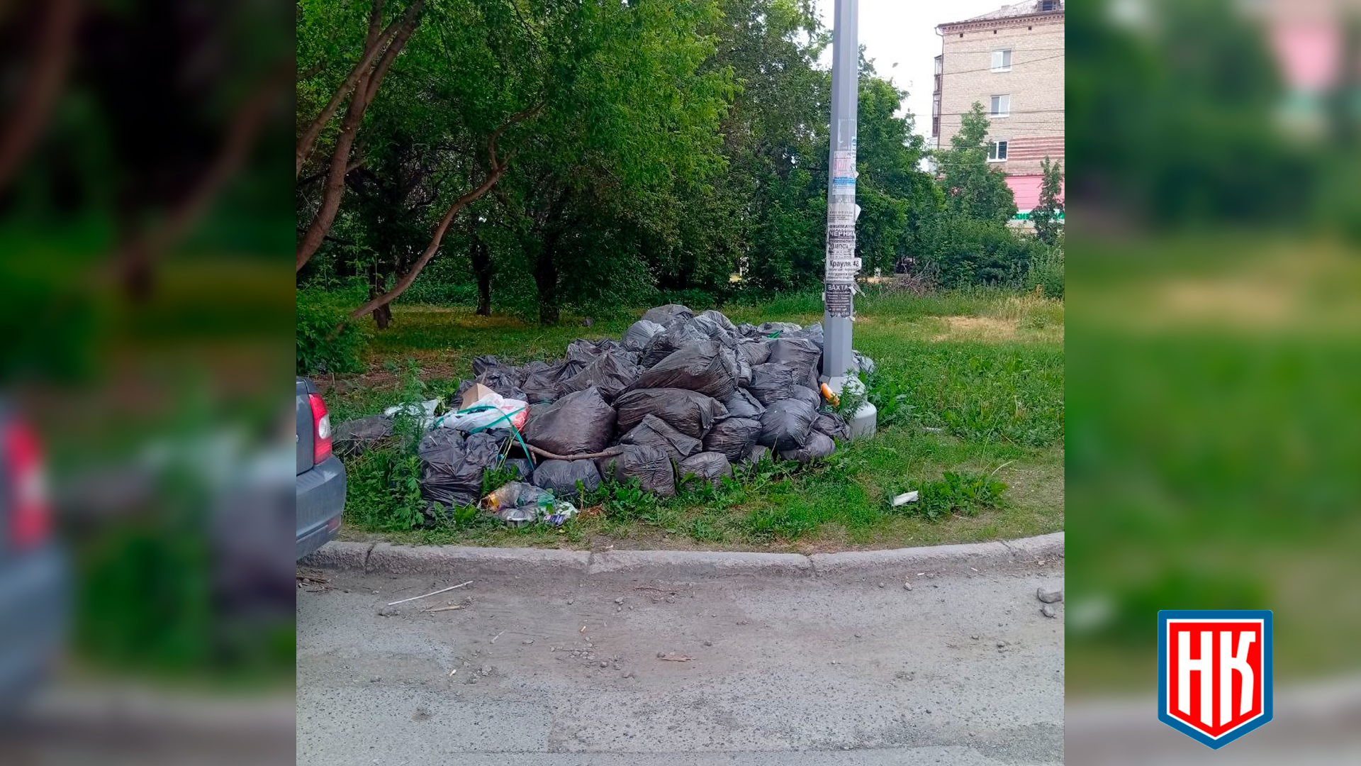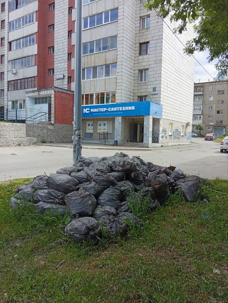 18 июня 2025 года. Город Екатеринбург, улица Крауля, 57. Вот такие мешки с мусором лежат. И некому, видать, убрать!