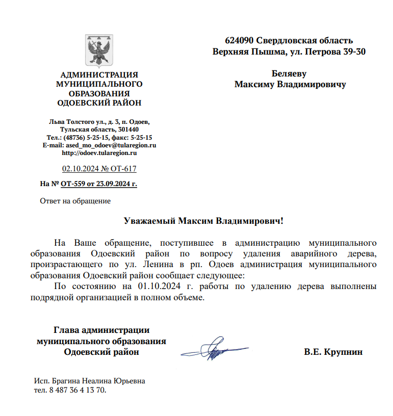 На следующий день был получен окончательный ответ из администрации Одоевского района.