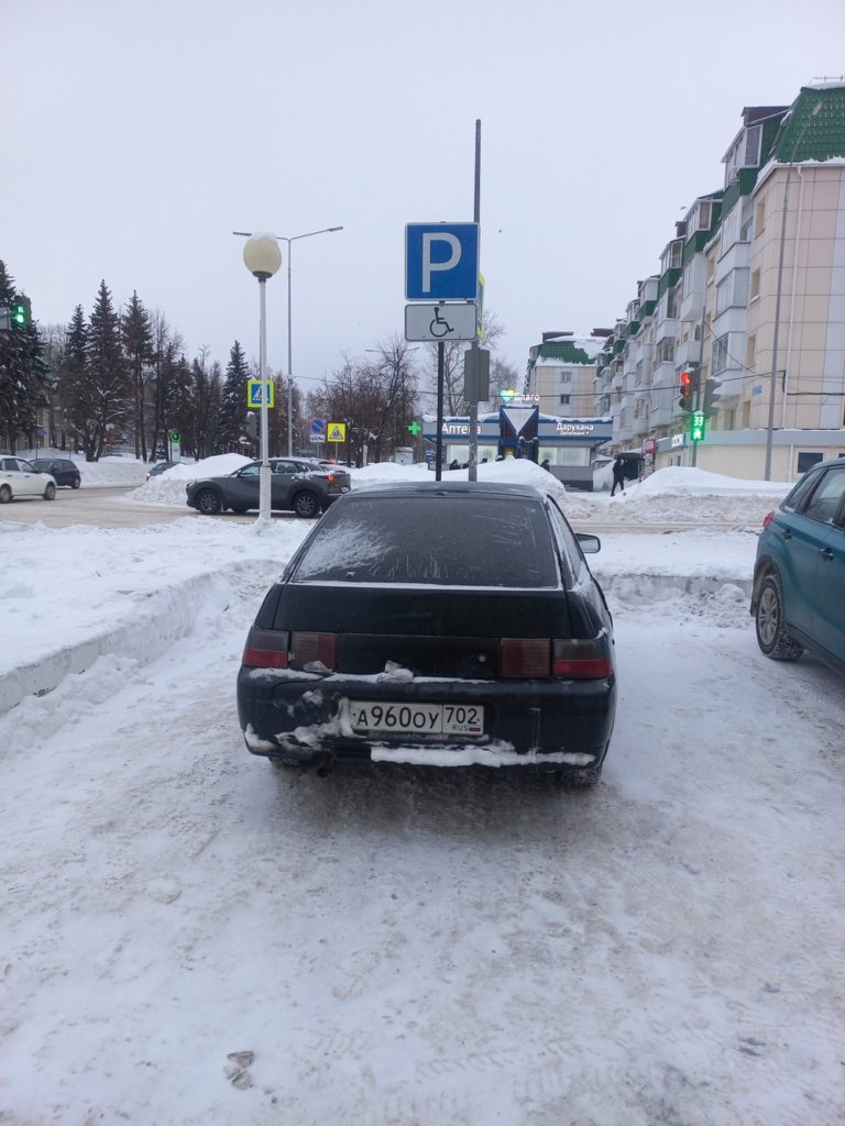 Республика Татарстан, г. Елабуга, проспект Нефтяников, 41. Стоянка перед Банком Зенит. Данный автомобиль припаркован на инвалидном месте (знак видно на фото). Знаков «инвалид» на машине нет, ездит на ней молодой человек. Машина ВАЗ 12й модели, гос номер А 960 ОУ 702. Машина припаркована с вечера 01.02.2024. В милицию совершено по тел 102 более трех звонков, экипаж для оформления нарушения обещали прислать так и не прислали. Прошу содействовать в принятии мер.