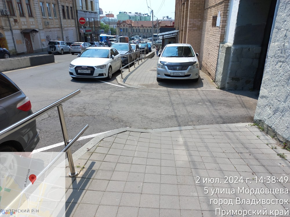 02.07.2024, 14:38. г. Владивосток, ул. Мордовцева, д. 5. Р844МН125, парковка на тротуаре