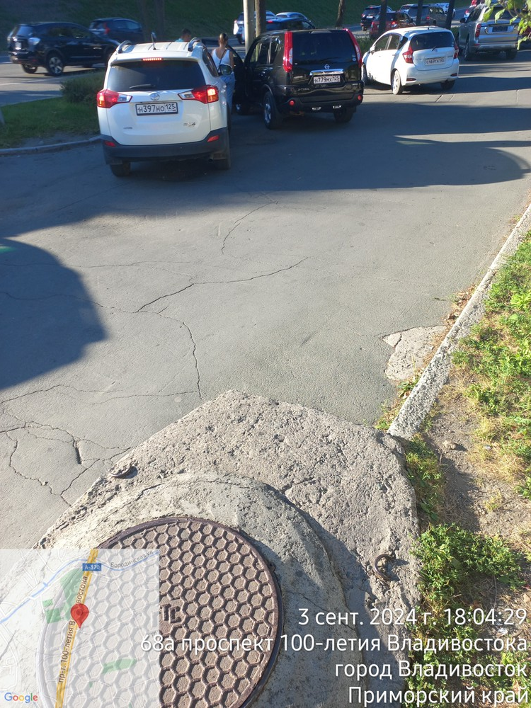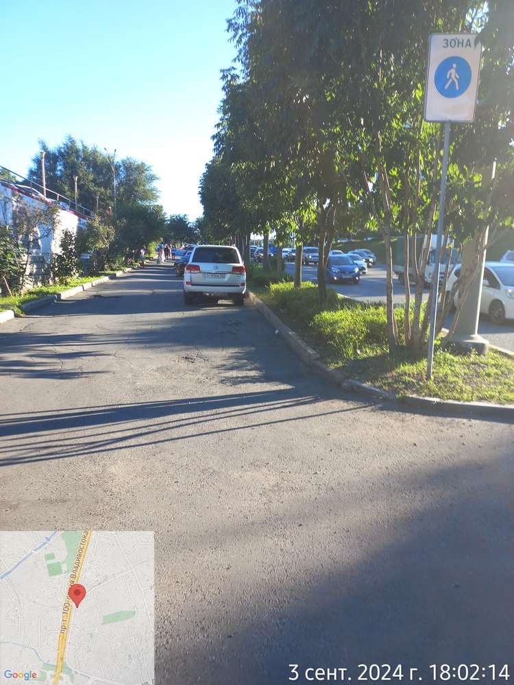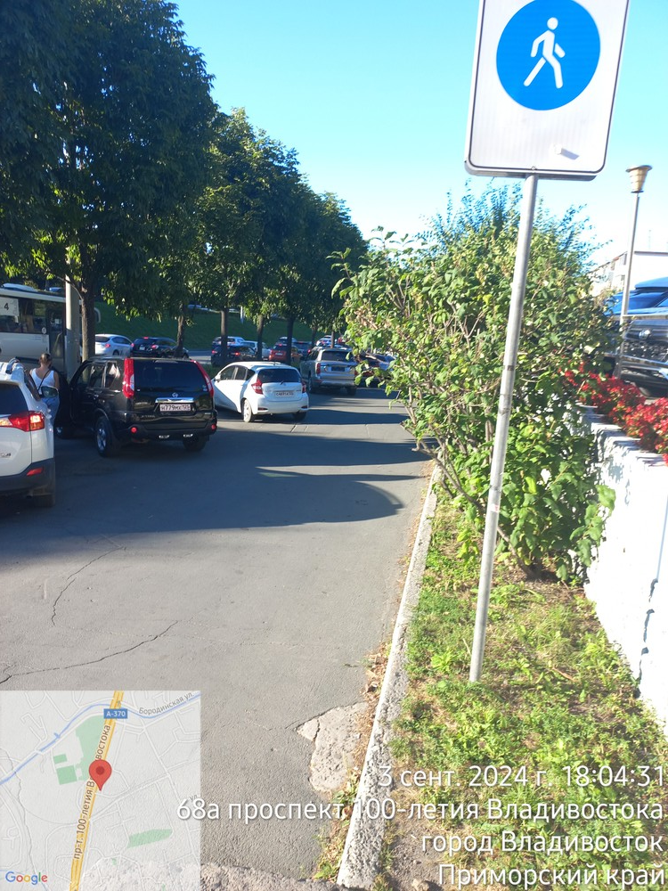 03.09.2024 18:02 Г. Владивосток, Проспект Столетия Владивостока д.68, Х189МК125, Н397НО125, Н779МХ125, С469ТА125 парковка на тротуаре под знаком Пешеходная зона.
