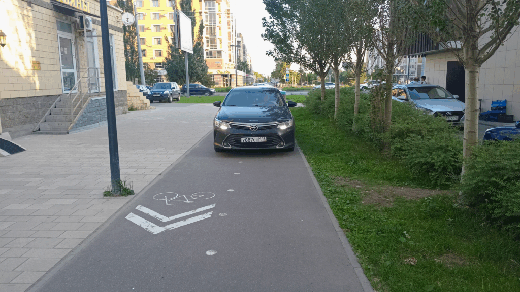 04.07.24 в 18:37 автомобиль Toyota Camry у887со 116 двигался, затем припарковался на велодорожке возле дома Абсалямова, 16 на бульваре Белые цветы в Казани в нарушение пунктов 9.9 и 12.4 ПДД.