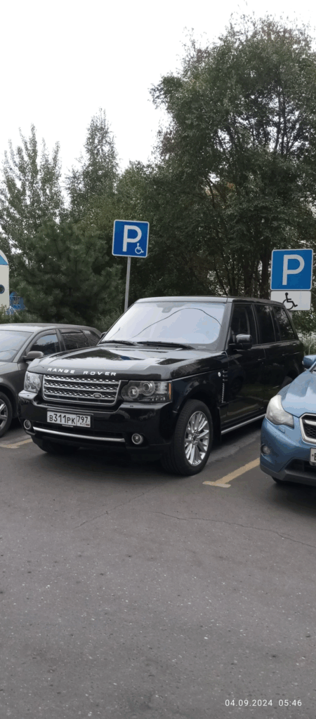 04.09.2024., 05 ч. 46 мин. г. Москва, Загорьевская ул., д. 25, автомобиль Ренж Ровер, чёрного цвета , гос. номер В311РК797, водитель данного авто постоянно паркуется на парковочных местах предназначенных для парковки инвалидов.