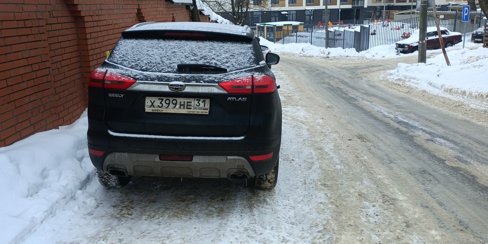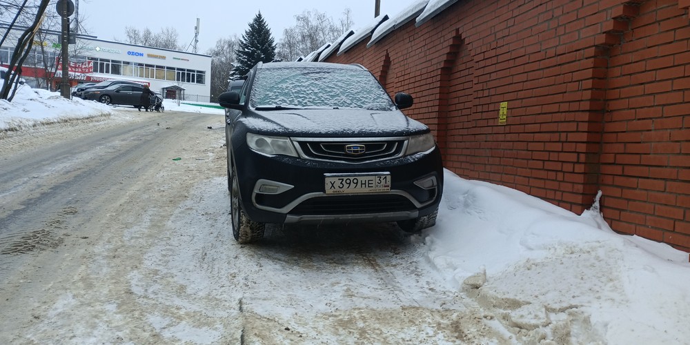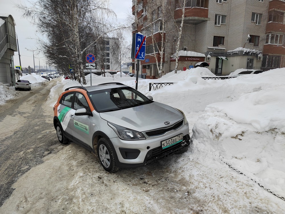 2-я Азинская улица, Казань. Стоит под запрещающим знаком, перекрыл въезд на парковку, частично стоит на проезжей части.