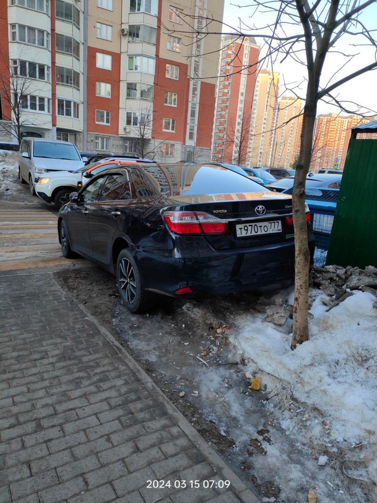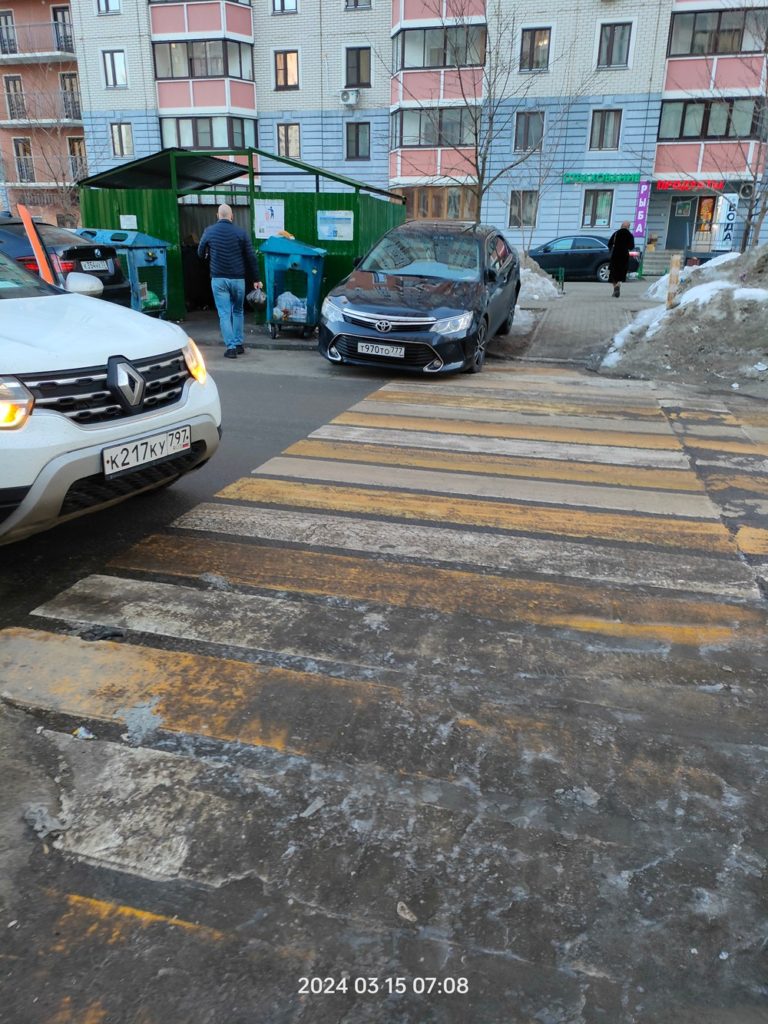 15.03.2024 в 07:09, Московская область, Красногорский район, Путилково, Спасо-Тушинский бульвар дом 7 (внешняя сторона дома, мусорная площадка). Парковка на газоне, пешеходном переходе, и мусорной площадке единовременно Т970ТО777 55.873555, 37.394580 (Яндекс карты).