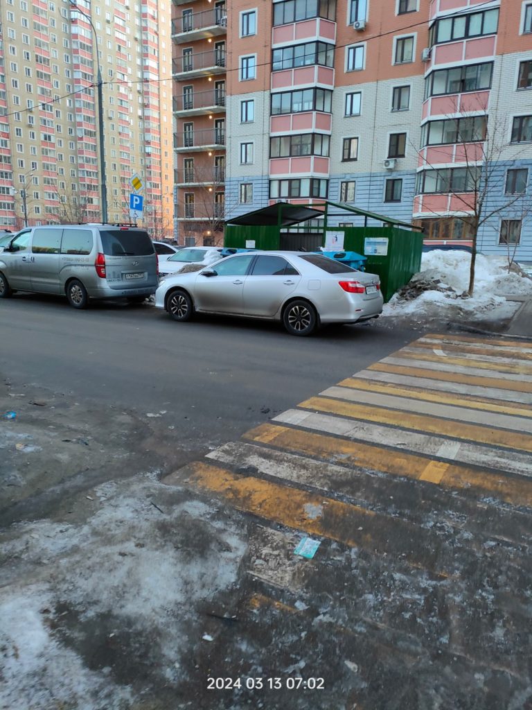 13.03.2024 в 07:03 Московская область, Красногорский район, Путилково, Спасо-Тушинский бульвар дом 7 (внешняя сторона дома, мусорная площадка) Парковка на газоне, пешеходном переходе, и мусорной площадке единовременно Р201ХС790 55.873555, 37.394580 (Яндекс карты).