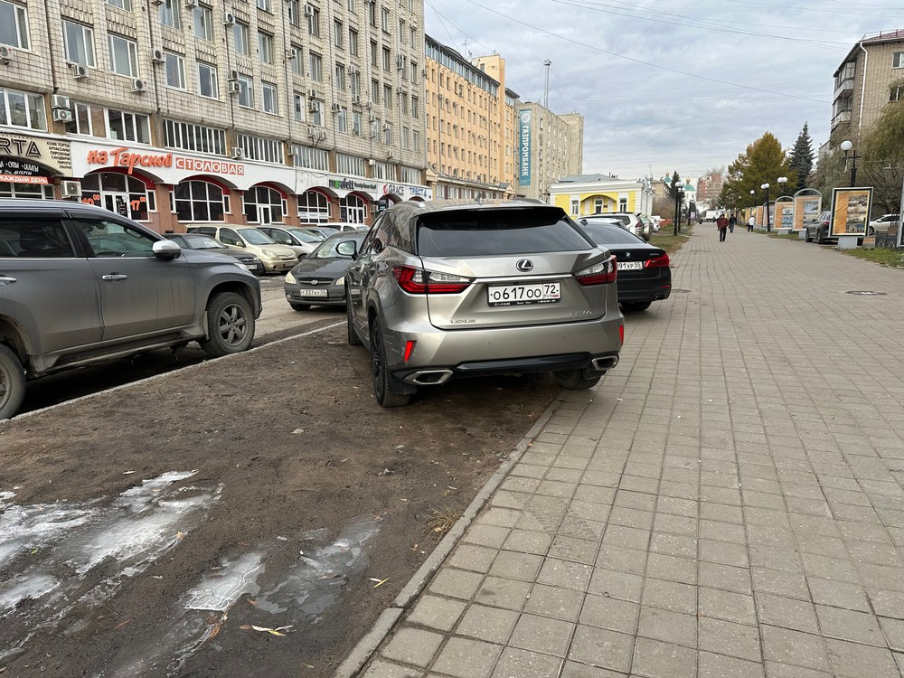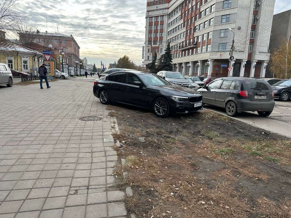 15.10.2024 г. Город Омск Улица Тарская 13а, напротив дома Парковка автомобилей У891ХР55, О617ОО72, Т024КО124 на газоне, на пешеходной части улицы.