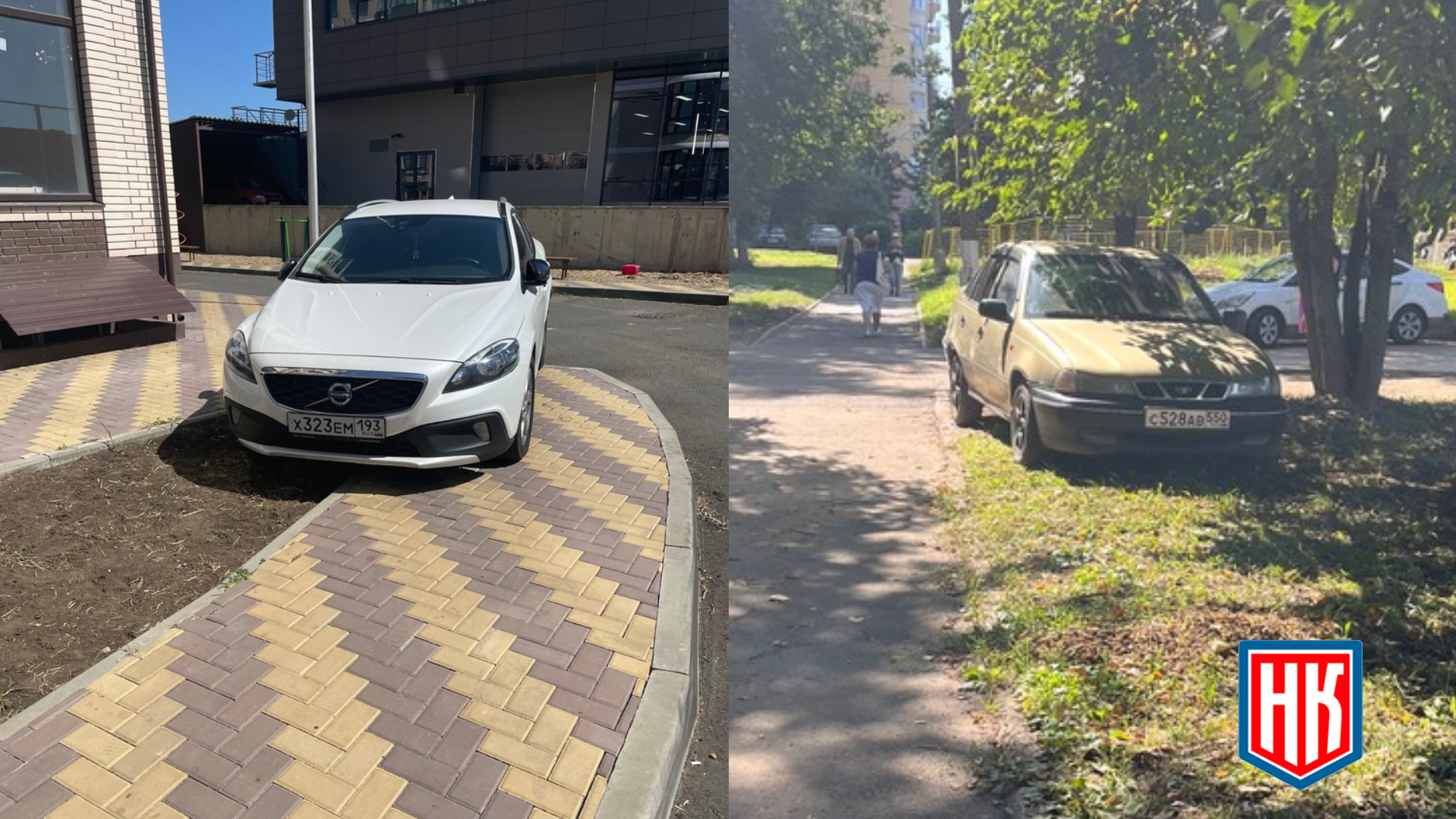 16.08.2024 Город Краснодар, улица Горячеключевская 7. Автомобиль припаркован на тротуаре и газоне.