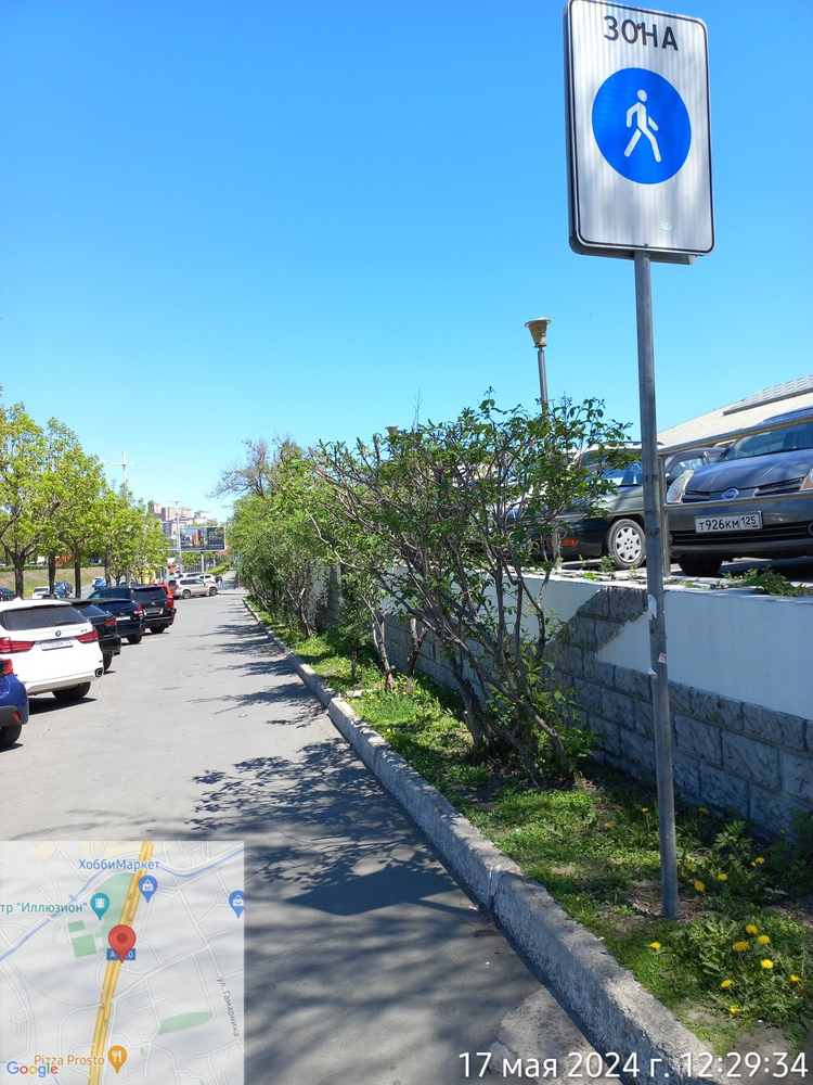 Г. Владивосток, Проспект Столетия Владивостока д. 68, 17.05.2024. 12:26 Suzuki — Т555ЕС125, Subaru — М223РК125 парковка и езда на тротуаре в зоне действия знака Пешеходная зона.