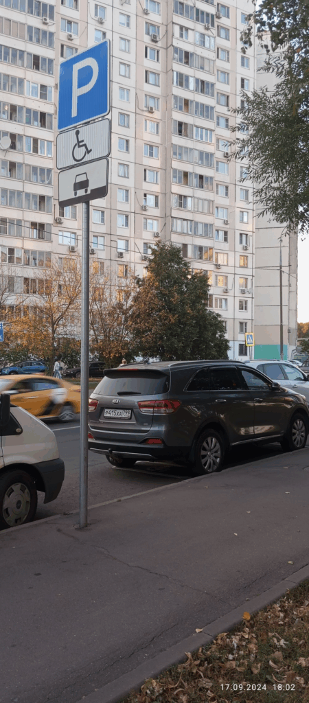 г. Москва, Загорьевская ул. д. 25, городская парковка , 17.09.2024 г., 18 ч. 02 мин.,водитель автомашины КИА, серого цвета, номнрной знак Р415ХА799, припарковал свой автомобиль на парковочном месте предназначенном для парковки инвалидов..