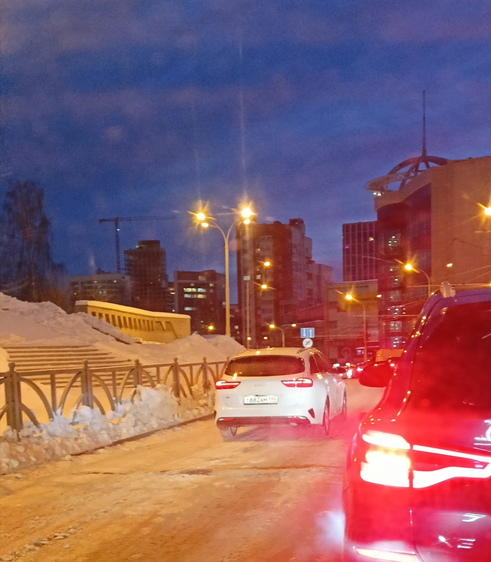 Г. Екатеринбург, 18 января 2024, 8 30. Участок дороги по улице Радищева от Гурзуфской до Московской. Нарушитель выехал на встречную полосу, таких много. Просим принять меры, блокируют проезд встречного транспорта, люди опаздывают на работу.