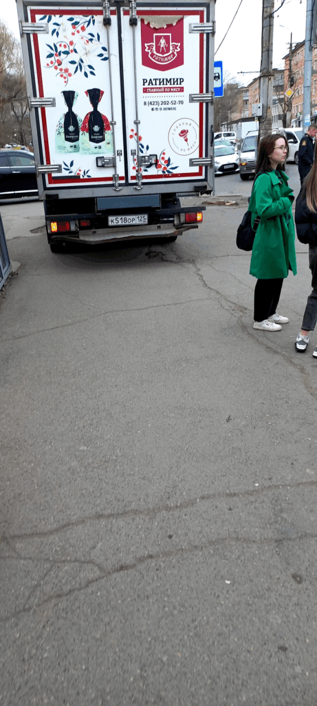 Г. Владивосток, ул. Русская, 39. Автохам припарковался, перегородил весь тротуар и ушел. Процесс разгрузки погрузки не осуществляет.
