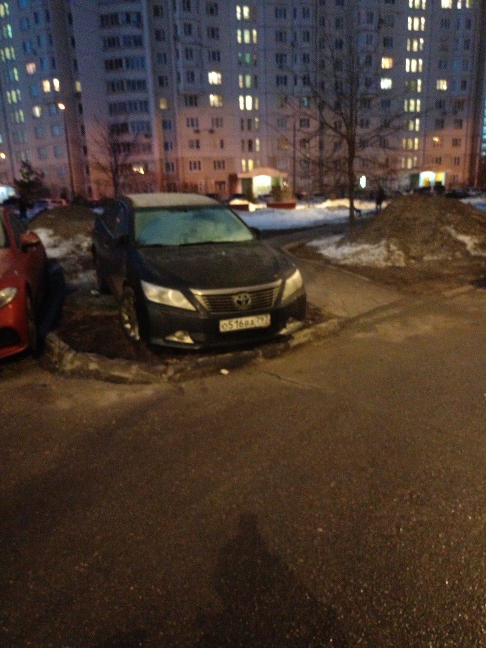 20 Марта 2024 год в 05:55. г. Москва, Волжский бульвар дом 11. Автомобиль Тойота стоит на газоне.