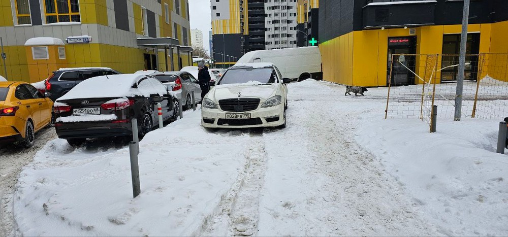 22.02.2024. Парковка на тротуаре/дорожке для пешеходов. Московская область, Красногорский район, Путилково, ул. 70-летия Победы, дом 2