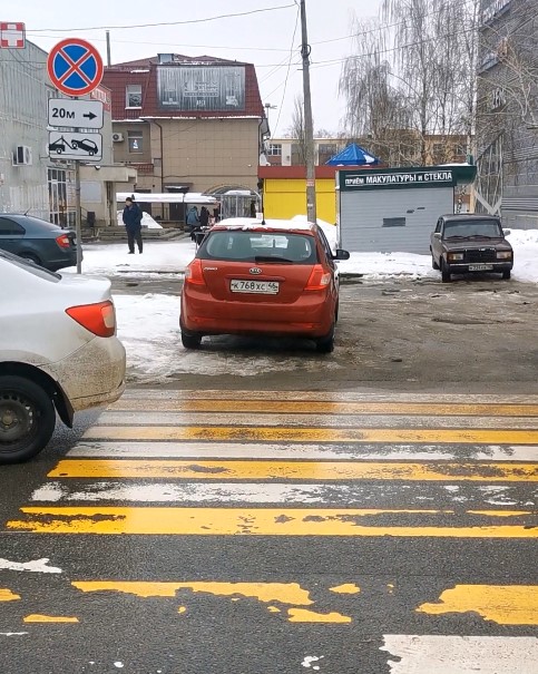 23.02.2024. г. Курск, проспект Дружбы, 2/12. Водитель данного автомобиля стоял под знаком «Остановка запрещена» на пешеходном переходе, что представляет собой серьезное нарушение правил дорожного движения.