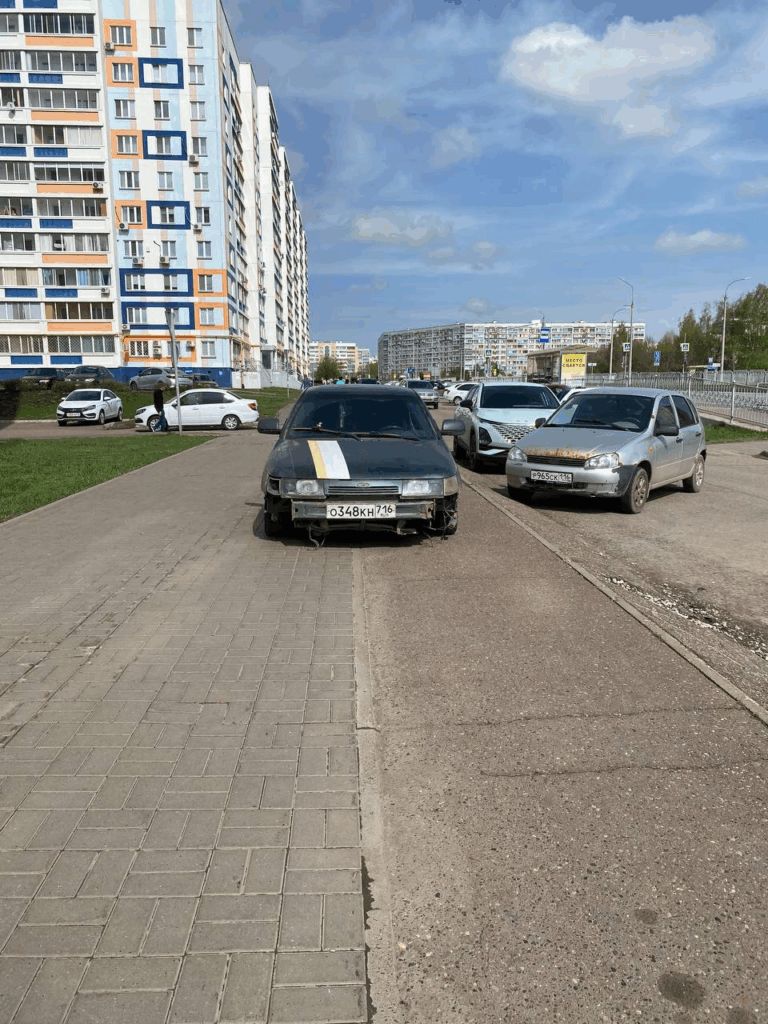 12:50, 36/7/2 Чулман, дом 19, Набережные Челны, стоит машина на тротуаре, где ходят люди с колясками.