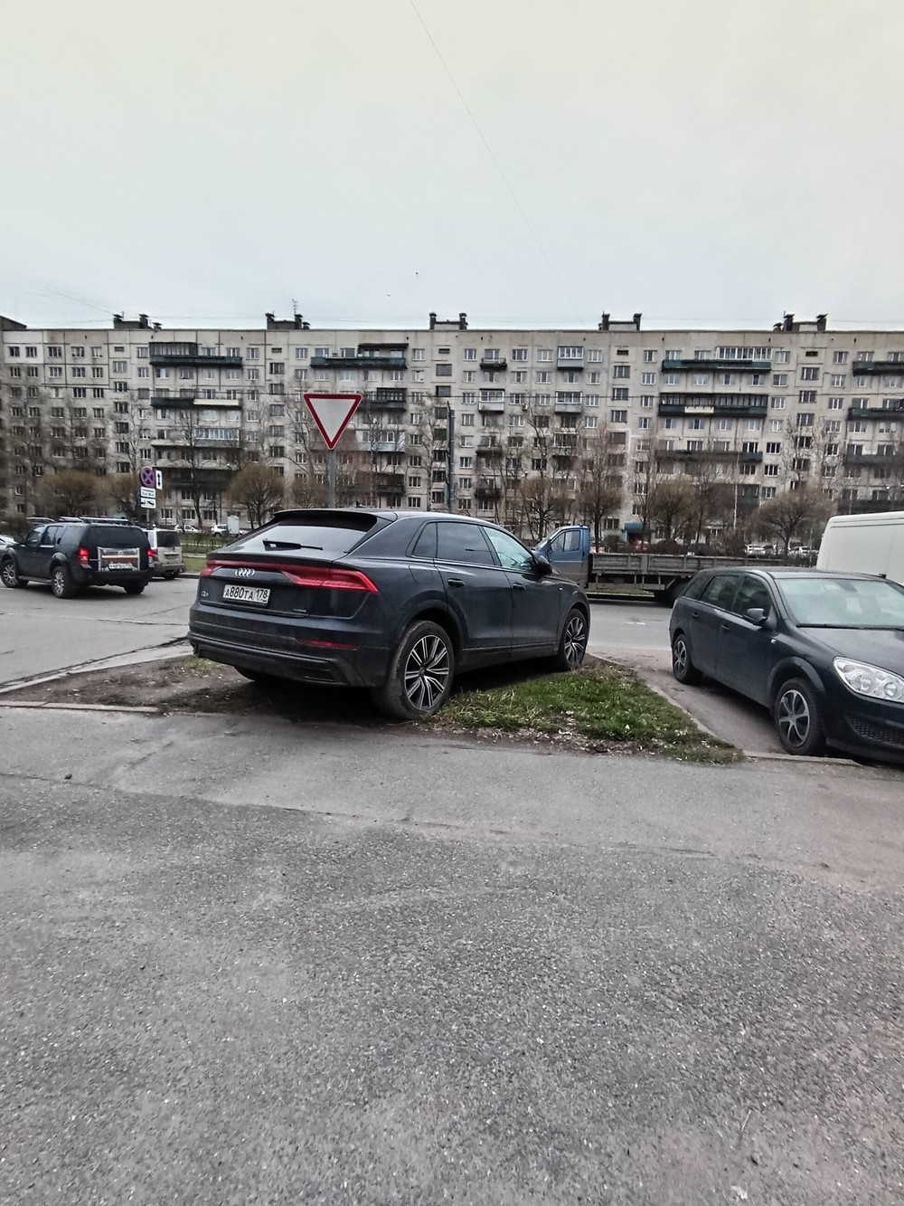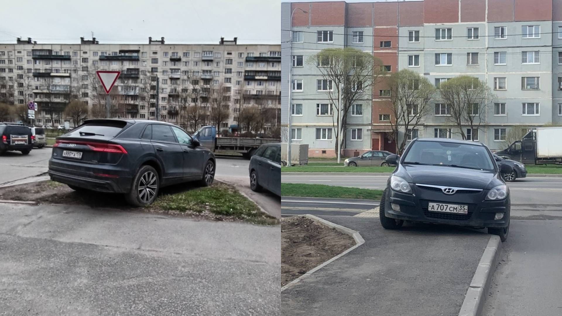 Санкт Петербург, ул. Антонова-Овсеенко, д. 20. 25 апреля 2024, 07:10 утра. Парковка на газоне.