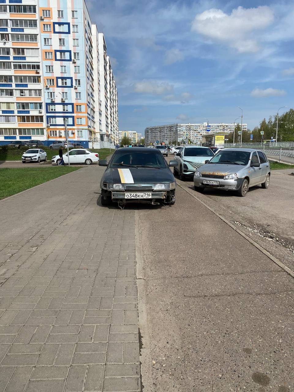 12:50, 36/7/2 Чулман, дом 19, Набережные Челны, стоит машина на тротуаре, где ходят люди с колясками.