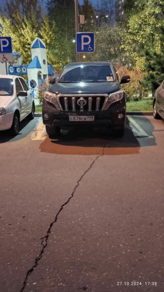г. Москва, Загорьевская ул. д. 25, 27.10.2024, 17 час. 39 мин., водитель автомобиля Тойота Ленд Крузер, номерной знак С878СВ799, совершил двойное нарушение ПДД, парковка на парковочном месте для инвалидов, незаконное использование знака «ИНВАЛИД» на лобовом стекле.