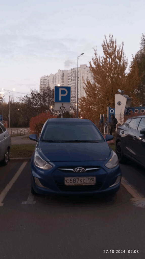 г. Москва, Загорьевская ул. д. 25, 27.10.2024., 07 час 03 мин., автомобиль Хундай , синего цвета, номерной знак С687КС790 припаркован, уже 3 -й день, на парковочном месте предназначенном для парковки людей с ограниченными возможностями.