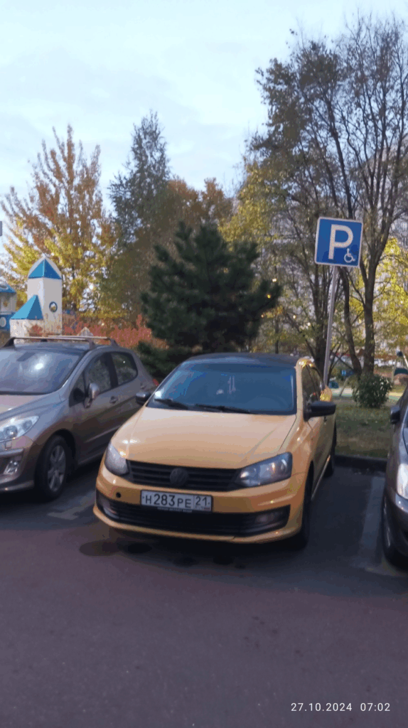 г. Москва, Загорьевская ул., д. 25, 07 час. 02 мин, автомобиль Фольксваген, желтого цвета, номерной знак Н283НР21, припаркован на парковочном месте для инвалидов.