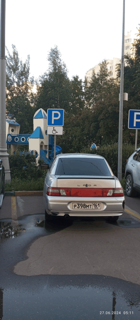 26.06.2024. в 05 ч. 11 м., по адресу г. Москва, ул. Загорьевская, д. 25, автомобиль Лада серого цвета, номерной знак Р398МТ161, был припаркован на парковочном месте инвалидов.