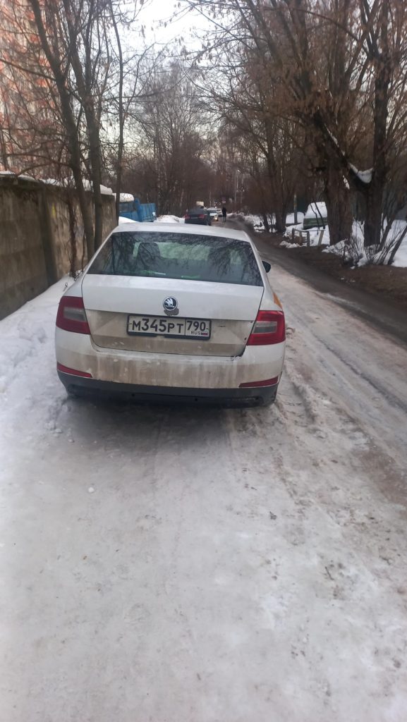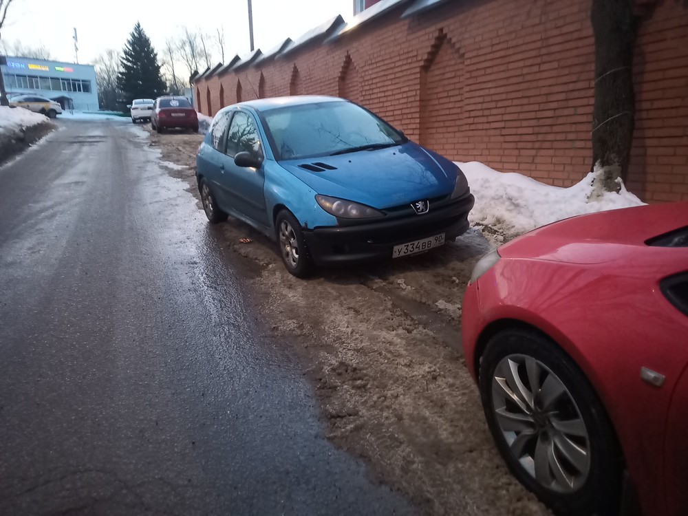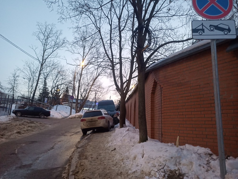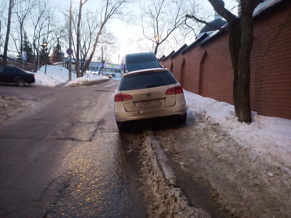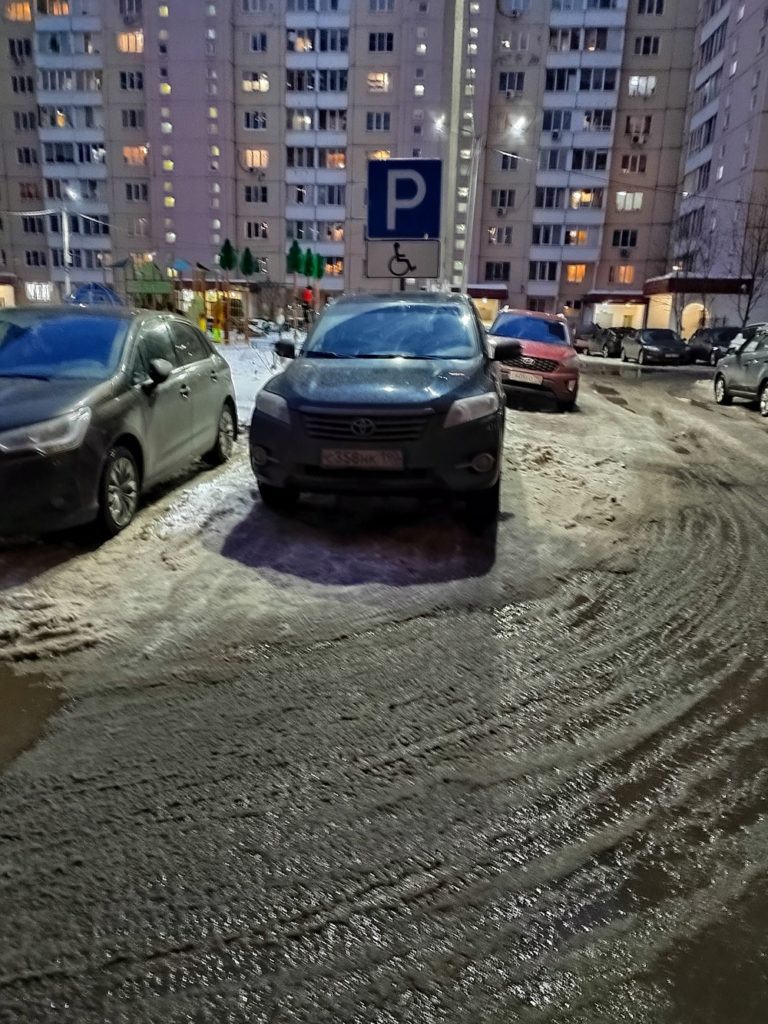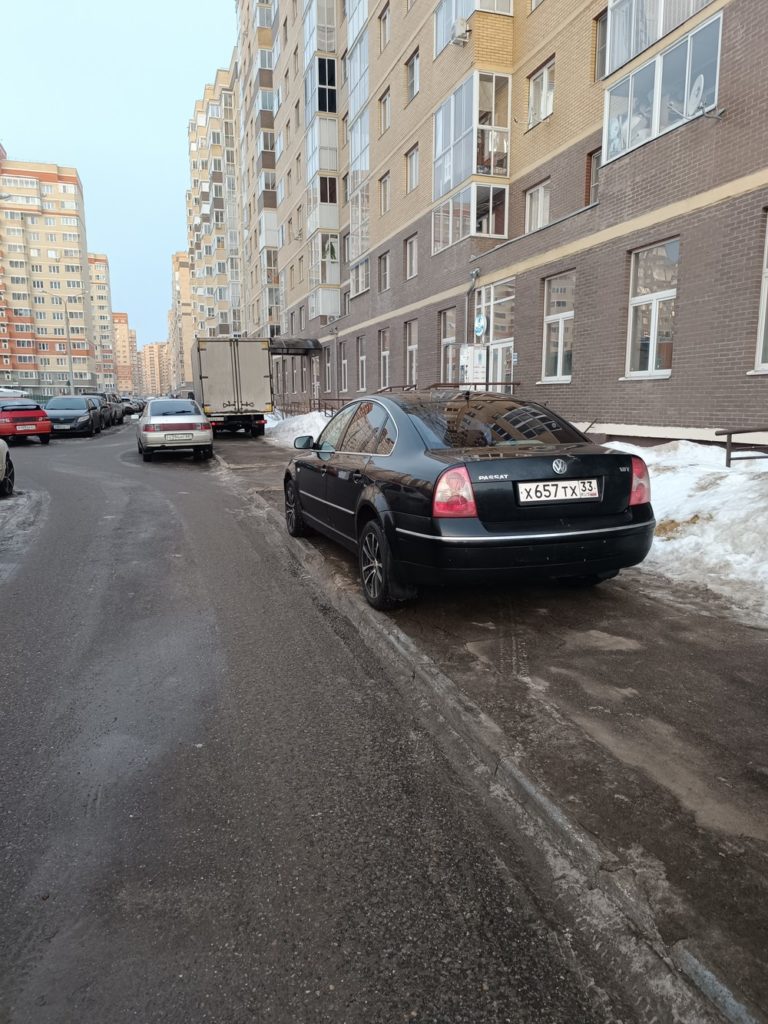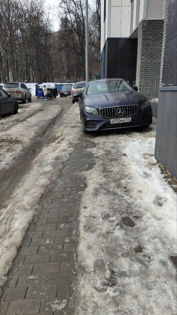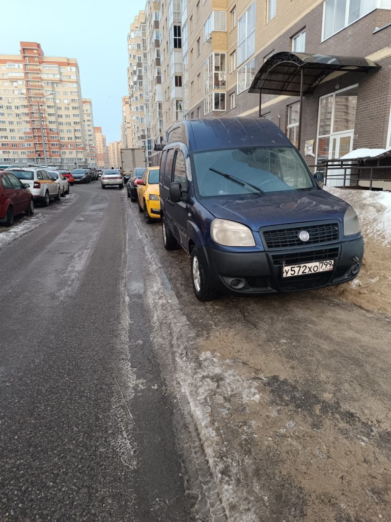 г. Москва, ул. Селигерская 32а. Постоянная парковка на тротуаре. Эта машина стоит сутки, по вечерам и по утрам весь бордюр усажен машинами. Сейчас скользко, обойти все это дело очень тяжело.