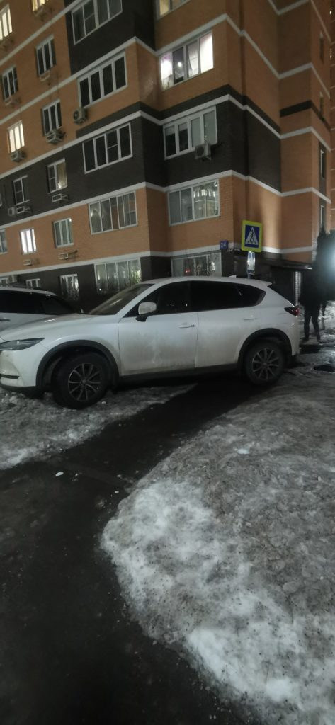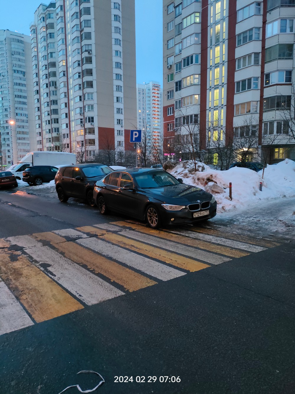 29.02.2024 в 07:06. Московская область, Красногорский район, Путилково. Пешеходный переход между домами Спасо-Тушинский бульвар 7 и Спасо-Тушинский бульвар 9 (55.873509, 37.394489) К129ОО797. Парковка на пешеходном переходе.