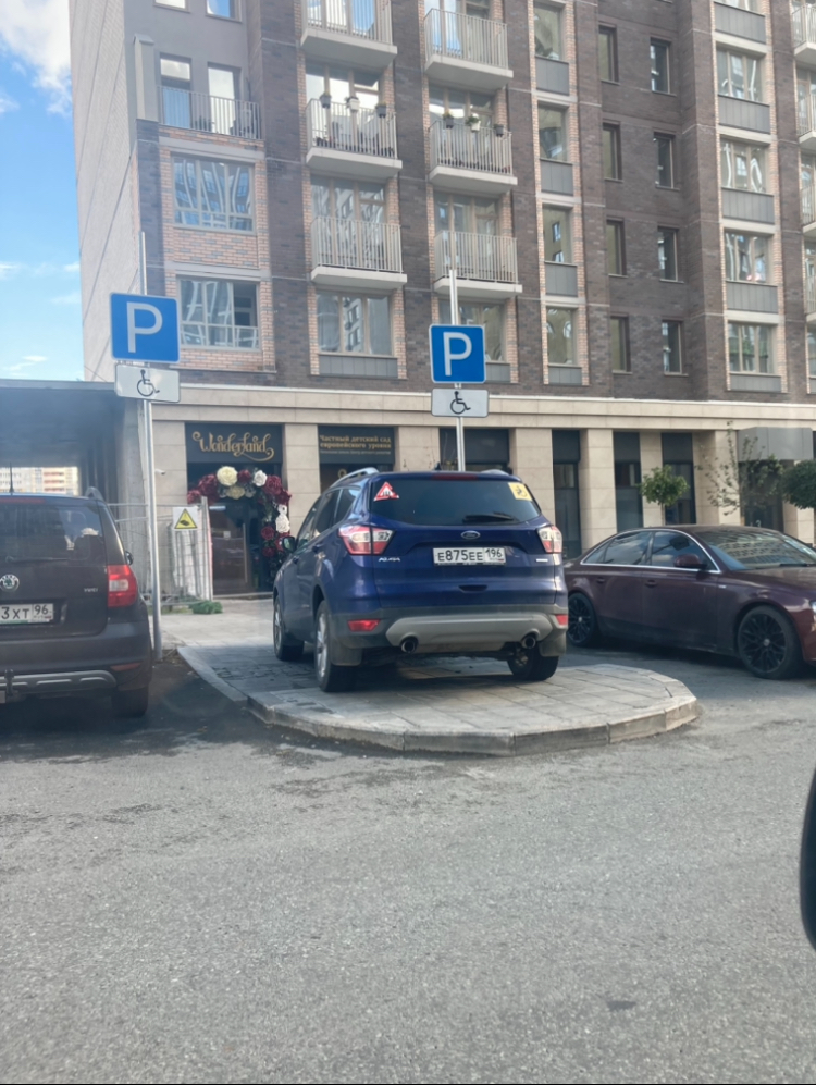 02.08.2024г. 18:05 г. Екатеринбург, ул. Циолковского 3. Комбо: 1. Стоянка на тротуаре 2. Использование знака «Инвалид» на транспортном средстве, не используемым инвалидом или перевозящим инвалида.