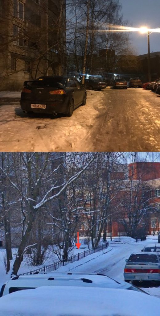 В ночь на 18 февраля 2024, Санкт-Петербург, Солидарности 10 к3 (дом одноподъездный). На фото обратная сторона дома. Ранее осенью 2023г., по периметру дома было убрано всё ограждение (забор), что в последствии привело к соблазну некоторых водителей там парковаться, скрин прилагаю. Под снегом довольно высокий переход с бордюрным камнем, а авто стоит в том месте, где были высажены молодые кустики.