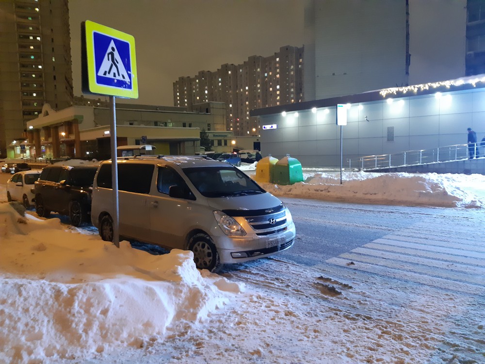 Москва, улица Гурьянова, дом 77. Машина стоит с нарушением прям рядом с пешеходным переходом и закрывает обзор пешеходам, создавая опасную ситуацию.