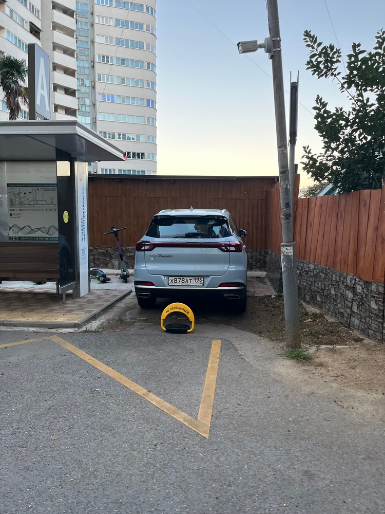 Добрый день! Кто то прямо рядом с остановкой общественного транспорта присвоил для парковки участок земли. г. Сочи, ул. Яна Фабрициуса, остановка институт цветоводства.