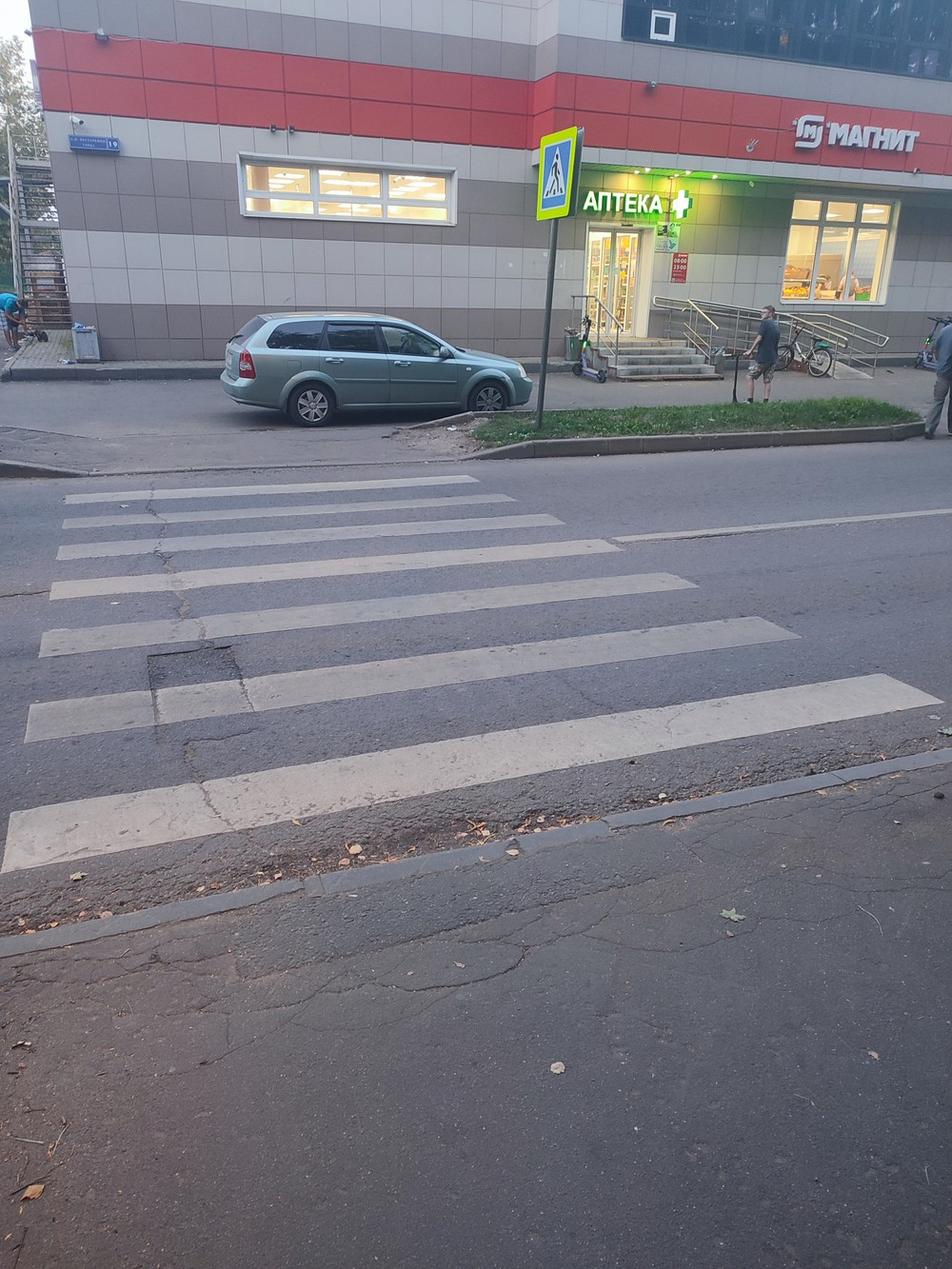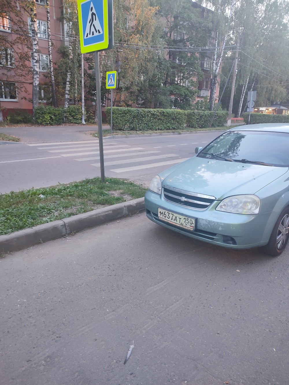 31.08.2024. Московская область, г. Королёв, улица А. И. Нестеренко, дом 19. Машина перекрыла пешеходный переход.