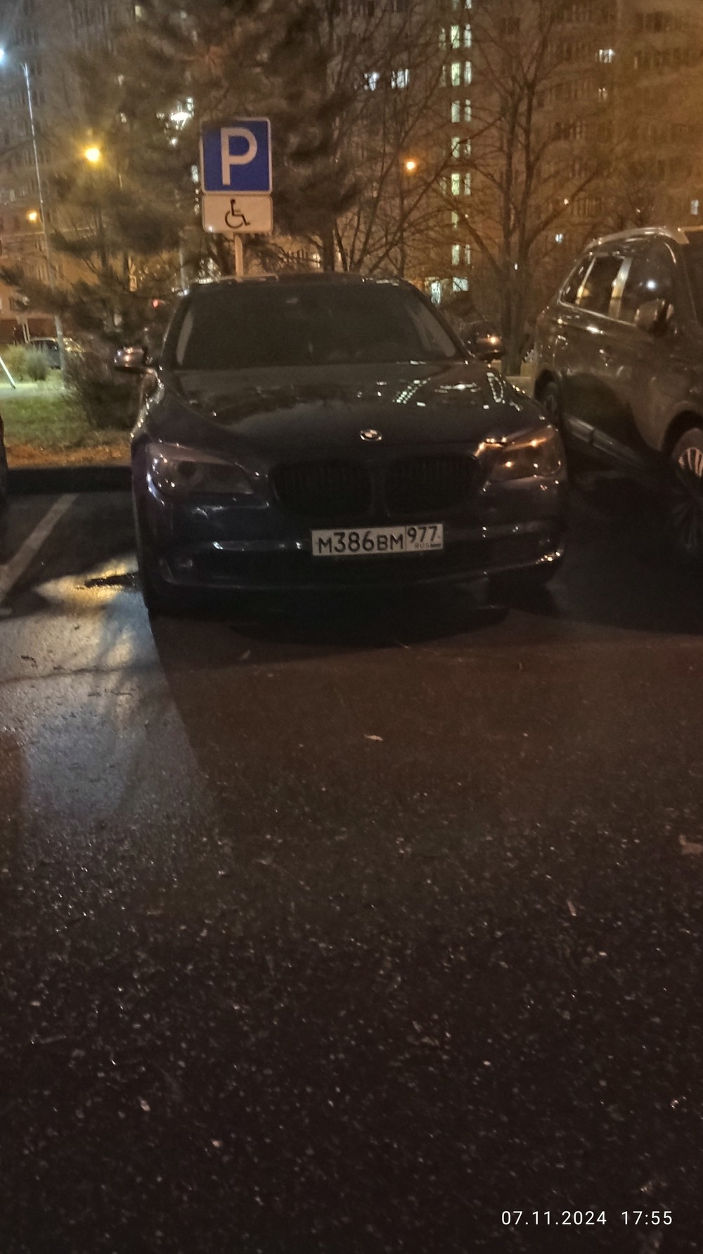 Г. Москва, Загорьевская ул., д. 25, 07.11.2024, 17:55. Автомобиль BMW черного цвета, номерной знак М386ВМ977, припаркован на месте, предназначенном для парковки инвалидов.