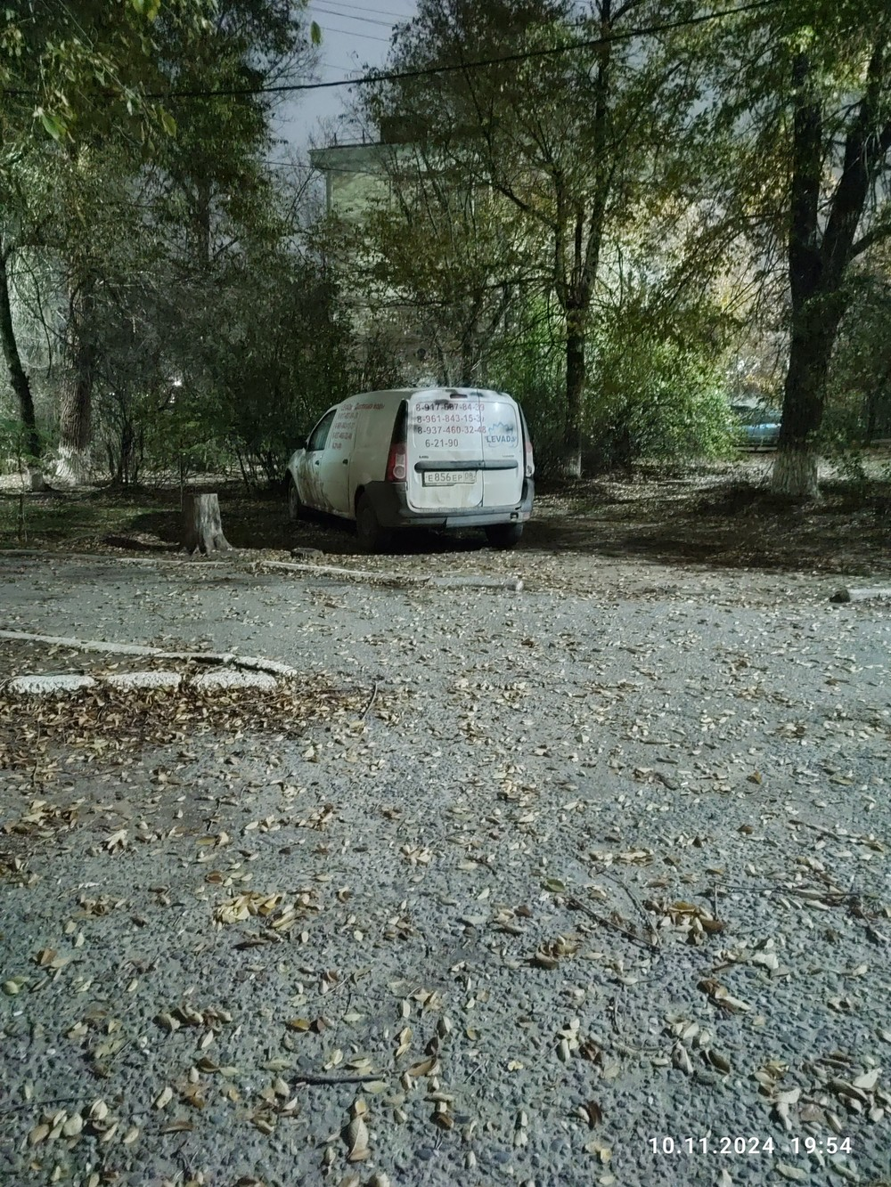 10.11.2024 г., г. Элиста, ул. Городовикова, д. 15. Парковка на газоне автомашины фирмы «Левада», госномер Е856ЕР08.