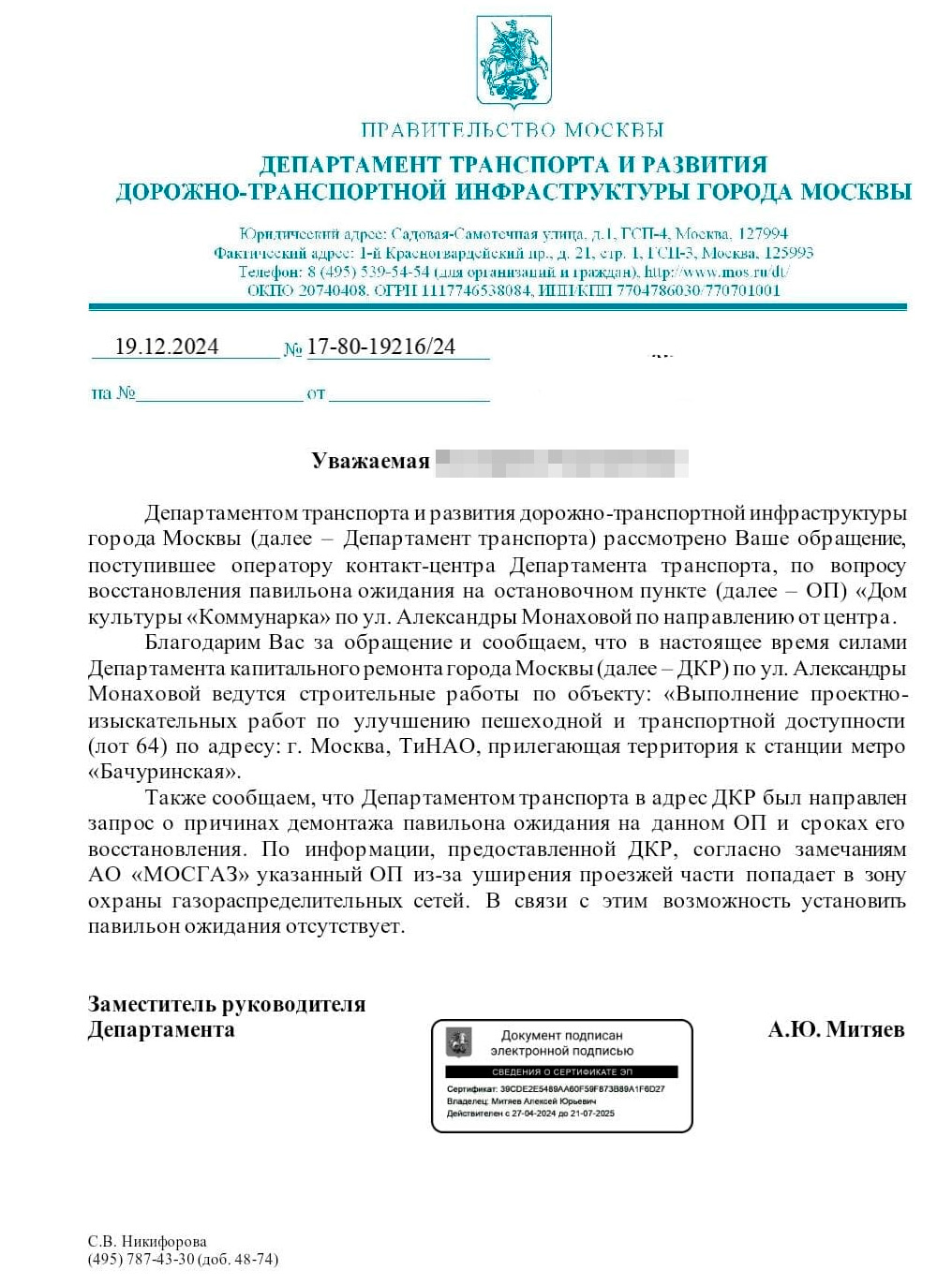Жители неоднократно обращались в Мосгортранс с просьбой установить павильон, однако получали отказы со ссылкой на техническую невозможность монтажа из-за подземных коммуникаций.