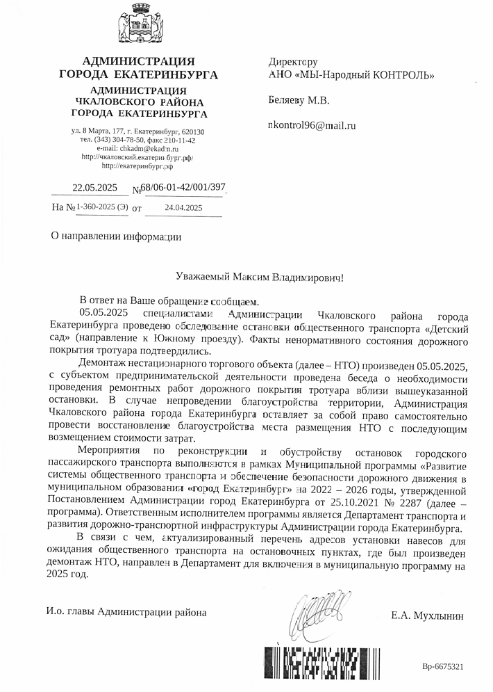 5 мая администрация Чкаловского района подтвердила факт нарушений и сообщила, что демонтировала незаконный торговый объект, обязав предпринимателя восстановить покрытие. В случае невыполнения работ власти пообещали сделать это самостоятельно с последующим взысканием затрат. Реконструкция остановки включена в муниципальную программу развития транспорта на 2022-2026 годы, однако точные сроки работ не указаны. Ситуация остаётся на контроле департамента транспорта.
